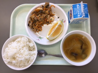 夏野菜の味噌汁、豚キムチ、河内晩柑、ご飯、牛乳
